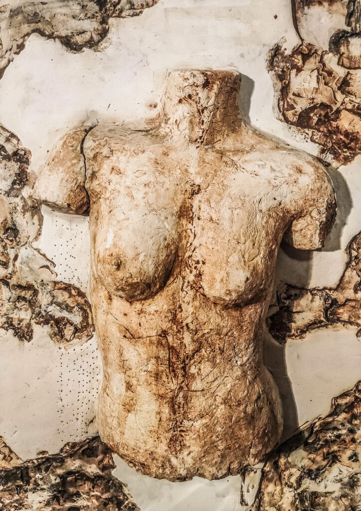 An inheritance of the artists of the past, where personality and subjectivity dissolve over time while only the work that they have left behind, lingers. 45 x 65 x 7 cm Bassorilievo made with plaster, clay, paint, 2024.